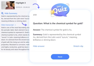 Jamworks AI Flashcards/revision quizzes feature supports the learning of dyslexic students as it eliminates the process of writing out notes by hand. Writing and reading are challenging areas for dyslexic students so the Jamworks app can be used as accommodations for dyslexia by producing automatically generated flashcards containing information taken directly from a student’s lesson. The flashcards can be customised via the accessibility adjustment tool to improve readability and users can watch the highlight clip from which the flashcard information was created to obtain further details.