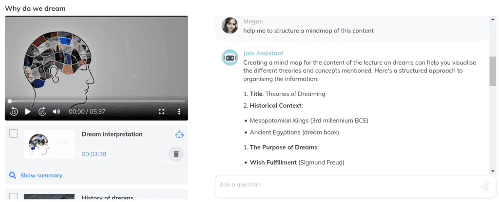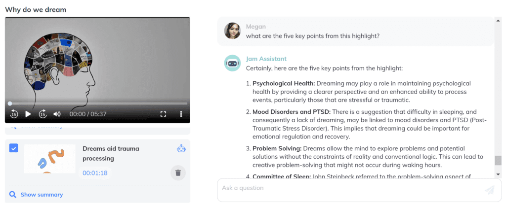 It can often be hard to analyse the key points from a section of lecture content, so the JamAI prompt “What are the 5 key points from this highlight?” is a useful one to remember to access this automatically. Having the key points from a highlight clip can help you to understand the content better as a whole due to it being broken down for you and explained in an alternative format. This prompt is useful as you can re-read/write these key points out repeatedly until the information is absorbed for learning.