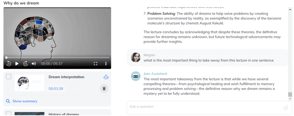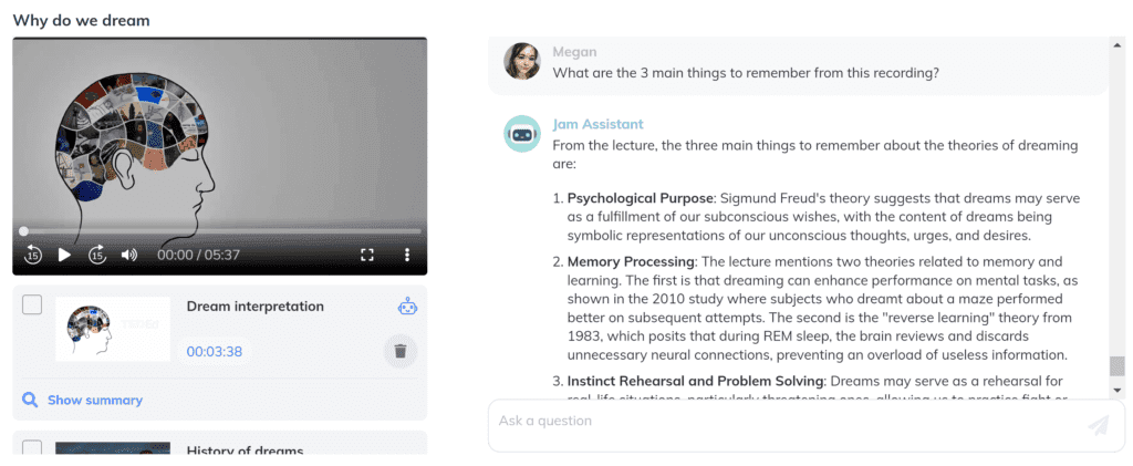By the time it gets to the end of a semester, the lectures you had in earlier weeks can seem like a lifetime ago. If you need to refresh your memory of the content covered in a previous class, the prompt “What are the 3 main things to remember from this recording?” is one of the great AI prompts for students to ask JamAI as you can access the information you need to remember in a quick and simplified method. This can help to trigger further memory of the content when you previously studied it in more depth and also makes sure that you are covering the most crucial aspects of the lecture that need to be remembered.