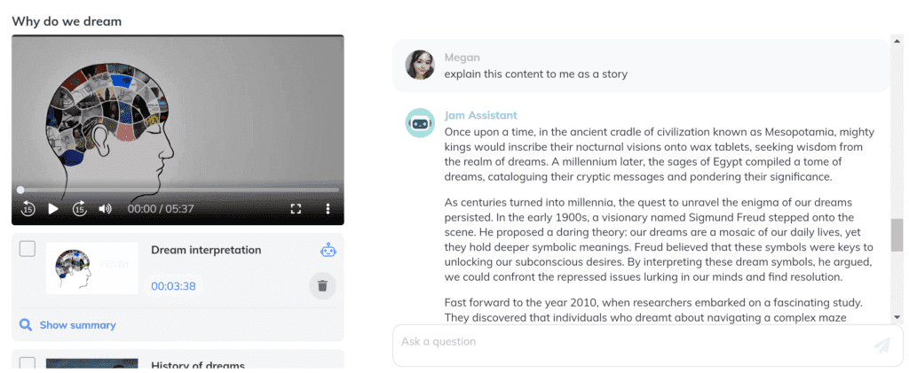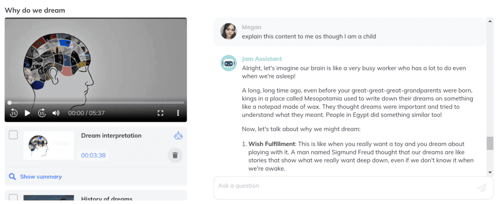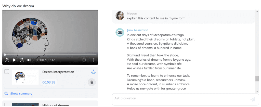 Many students find rhythm and sound to be a beneficial way to remember content for exams and help understand the topic better. If this is the case for you then I recommend trying out the “explain this content to me in rhyme form” prompt with JamAI. You can use this to help your study process as the JamAI chatbot will construct a rhyme/song of either specific highlight content or the entire recorded session for you to recite, sing and become familiar with and understand. It is known that particular tunes and rhythms associated with content can help students to remember information more easily so try this one out and see how effective it is for you!