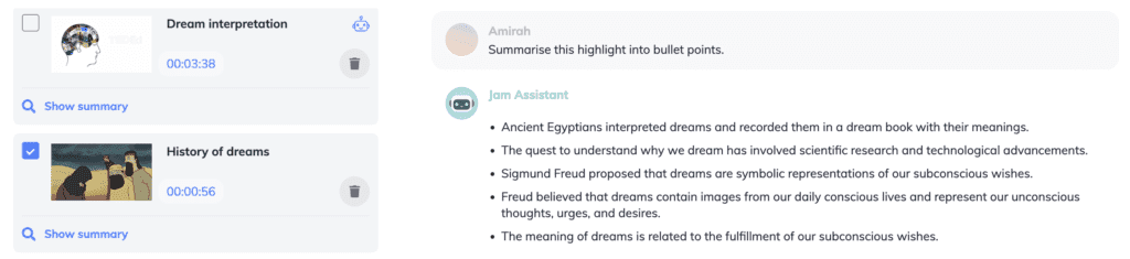 You can ask JamAI questions to explore and make sense of the topics discussed in an entire lecture. Or, you can select specific highlights to break down your exploration into manageable chunks.